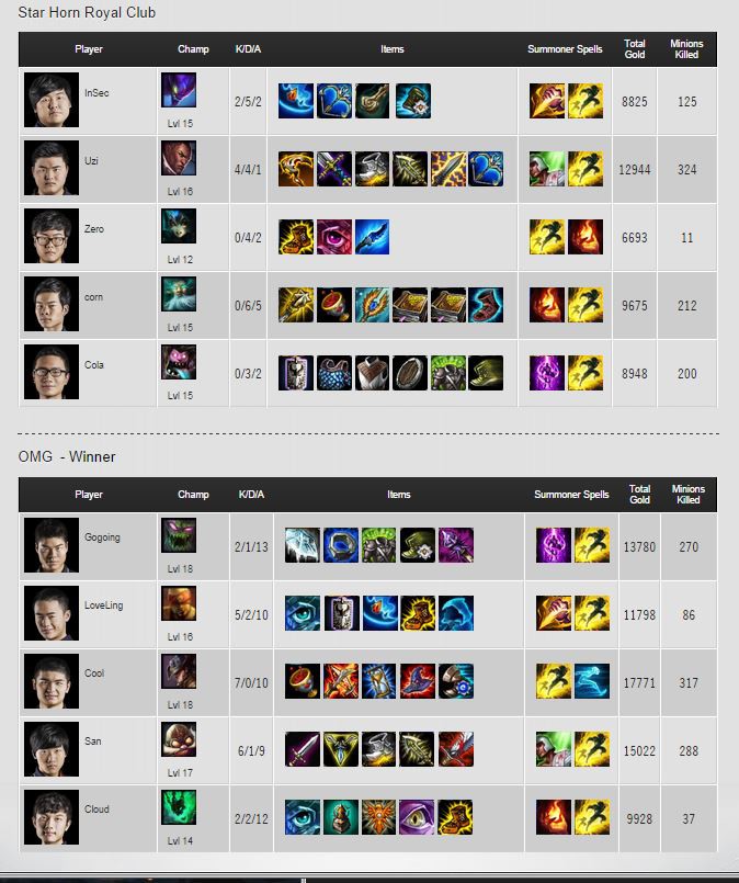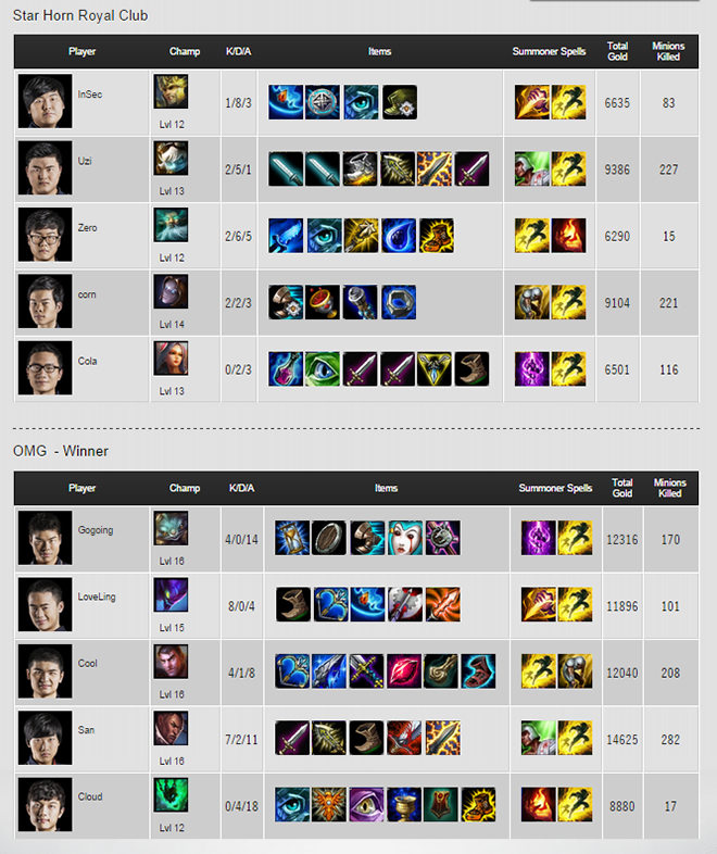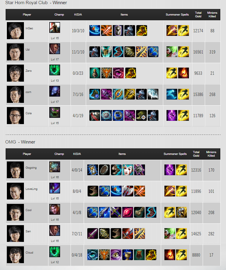 OMG will mit Level 1 den Blue invaden, doch Starhorn steht schon bereit und tötet Nidalee und Twisted Fate. Dieser (Twisted Fate) bekommt auch direkt danach Probleme, nachdem Twitch und Janna von der Lucian-Thresh-Toplane nach unten rotieren. Mit Fiddlesticks kann schon früh der erste Drachen geholt werden. OMG übernimmt aber im Laufe des Spiels die Kontrolle über die Karte. Es fallen wenig Kills, aber OMG hat die Hoheit über die nächsten 4 Drachen. Bis zur 30. Minute hat OMG 9.000 Gold Vorsprung. Erst in der 34. Minute bekommt Starhorn endlich einen Angriff hin. Sie töten drei Gegner, die beiden Türme in der Mitte samt Inhibitor und rotieren zum Baron. Sie können den Baron sogar töten, verlieren aber den Buff fast komplett, nachdem OMG sie angreift. OMG kann ihrerseits den oberen Inhibitor zerstören. Von nun an geht es vor und zurück. OMG engaged in der Mitte auf Starhorn, OMG kann aber antworten und tauscht 4 gegen 1. Starhorn holt erneut den mittleren Inhibitor und beide Nexustürme, doch Twisted Fate kann den Nexus verteidigen und in den folgenden Scharmützeln sterben Twitch und Janna gegen Twisted Fate und Nidalee.