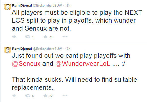 Der Midlaner und Star der Mannschaft Chres 'Sencux' Lauren, sowie der Toplaner Martin 'Wunderwear' Hansen können bald nicht mehr für Team Dignitas EU spielen. Warum? Man muss für die LCS ein Mindestalter von 17 Jahren haben, beide Spieler sind noch unter 17. In der regulären Saison der Challenger Series ist es kein Problem, falls ein Mitglied unter der Mindestgrenze liegt. Jedoch hat Riot Games veranlasst, dass alle Spieler bereit sein müssen, um in der LCS zu spielen. Das geht aber nur, wenn derjenige das siebzehnte Lebensjahr erreicht hat. Somit können 'Sencux' und 'Wunderwear' nicht an den Playoffs teilnehmen. Beide Spieler werden erst ab der Hälfte dieses Jahres diese Grenze erreichen. Dann wären sie auch fähig, in der LCS zu spielen. Jedoch ist das ein langer Weg, da sie erst 2016 in der Spring Split antreten würden.