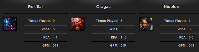 Chasers meistgespielter Champion ist bisher, mit großem Abstand, Rek’Sai. Die wunderschöne Lady ermöglicht ihm einen gewissen Grad an Kontrolle über die Karte und außergewöhnlich gute Scharmützelfähigkeiten. Sie glänzt darin, im frühen Spielverlauf die Lanes zu überfallen und somit den Lanern den Vorteil zu verschaffen, den sie brauchen. Was damit gesagt werden soll, ist, dass das Leerenmonster einfach zu seinem Spielstil perfekt passt. Falls sie nicht verfügbar ist, weicht Chaser auf Gragas und Nidalee aus, welche ähnliche Rollen spielen.