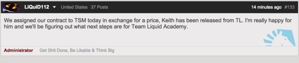 UPDATE: Laut lolesports.com, Riots offizieller Seite zur LCS, steht Keith ab sofort in der Startaufstellung von TSM. Seitens der Mannschaft gibt es noch keine öffentliche Stellungnahme. Steve Arhancet untermauert die Vermutung, dass TSM seinen neuen Schützen am kommenden Wochenende gegen Team Arena Online austesten wird.