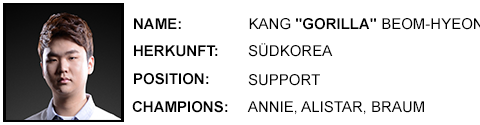 In KOO Tigers Spiel-Stil spielt vorallem Support Gorilla eine große Rolle. Er fängt oft schon damit früh an, den gegnerischen Jungle mit Wards voll zu stellen und gankt zudem oft auch die Midlane, um Kuro einen frühen Vorsprung zu verschaffen. Da die Tigers oft ihre Lanes tauschen und dem ADC damit eine 1v1-Lane gegen den gegnerischen Toplaner verschaffen, hat Gorilla umso mehr Raum und Zeit, seinen Spielstil zu zeigen.