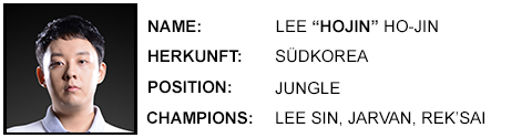 Auch für Jungler hojin kamen die letzten Patches kurz vor den Worlds wie gerufen. Die Verbesserungen des Jungle-Items "Warrior" spielen dem Koreaner in die Karten. Denn genau diese Art von AD-Champions liebt er zu spielen. Durch den Aufstieg von "Warrior" und den Abfall von "Cinderhulk", werden wir auf den Worlds sicher auch mal ein Rek'Sai-Spiel mit der Schadens-Variante sehen. Außerdem ist er bekannt für Champions wie Jarvan IV und Lee Sin, die ebenfalls von den Veränderungen profitieren.
