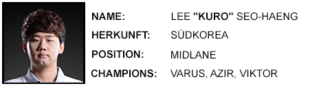 Midlaner Kuro gilt als sehr solider und sicherer Spieler auf seiner Position. Er erlaubt sich selten Fehler, was ihm nun auch zwei Splits in Folge die höchste KDA der Midlaner in Korea bescherte. Vor seiner Zeit bei den Tigers spielte er bereits für Najin Black Sword, wo er bereits als großes Talent galt.