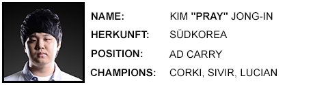 Auf der Position des ADC sind die KOO Tigers mit Pray sehr gut besetzt, der als Spieler schon seine gesamte Karriere Lob von allen Seite erhielt. "imp" bezeichnete ihn einst als "ein Genie auf seiner Position". Dieses Jahr spielte er solide und erreichte genau wie sein Midlane-Kollege Kuro, im Spring Split die höchste KDA aller Schützen in Korea. Ob er jedoch auf dem Niveau von anderen internationalen AD Carries ist, werden wir bald sehen. Vorallem das Duell mit CLG's Doublelift wird sehr interessant anzuschauen sein.