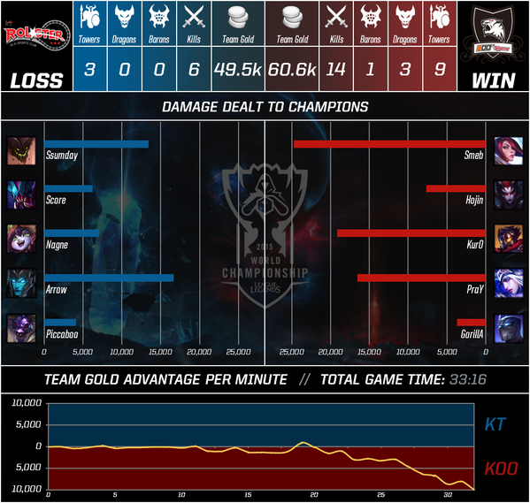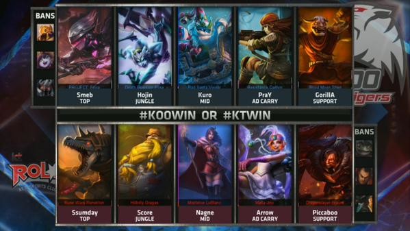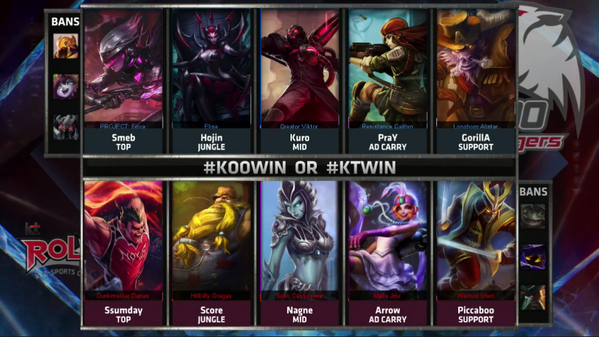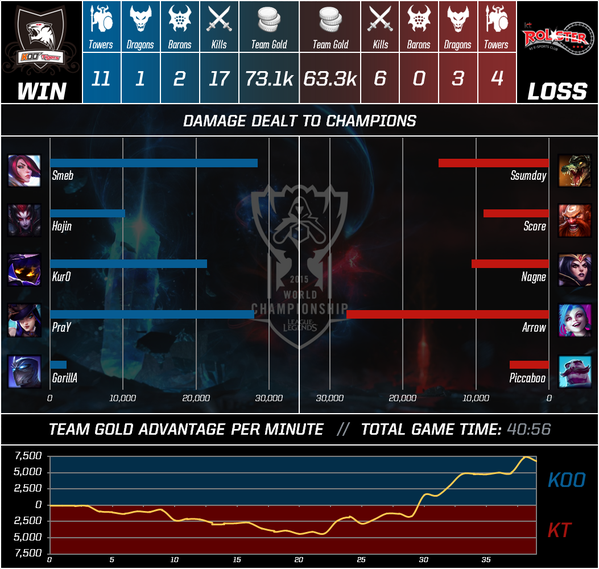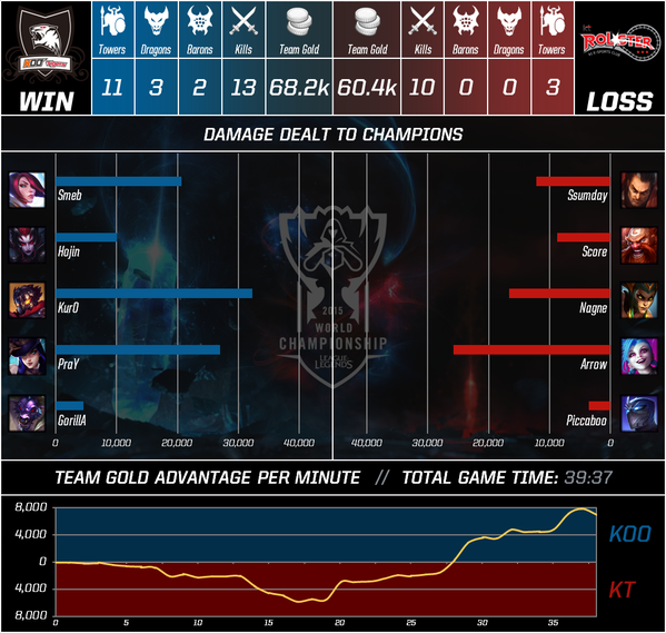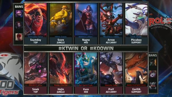 Erneut sahen wir in der Mid-Lane das Aufeinandertreffen von LeBlanc gegen Veigar wie bereits im vorherigen Spiel. Doch die Pick & Bann-Phase war nicht das Einzige, was an das erste Spiel erinnerte. Erneut gab es früh viel Action in der Top-Lane. First Blood und kurz danach auch den zweiten Kill für KT und Ssumday's Renekton gegen Smeb's Fiora. Doch durch einen schönen Gank von Lee 'Hojin' Ho-Jin konnten die Tigers nach 8 Minuten auf der Top-Lane ebenfalls ihren ersten Kill holen. Nach 11 Minuten startete die Action dann auch auf den anderen Lanes. Dong-bin 'Score' Go erneut mit einem starkem Gank, dieses Mal auf der Bot-Lane, der KT zwei Kills bescherte. Durch diesen Gank bekam KT ihren ersten Turm im Spiel und damit die Kontrolle auf der Karte. Sie platzierten viele Wards im gegnerischem Jungle und übten viel Druck auf weitere Türme aus, während KOO mit schwachen Teleports nicht darauf antworten konnten. Und mit den Paralellen zum ersten Spiel nicht genug: Auch jetzt sorgte wieder ein Fehler des Mid-Laners (diesmal Sang-moon 'Nagne' Kim) dafür, dass das gegnerische Team zurück ins Spiel fand. Er positionierte sich, wie sein Lane-Gegner kurO im ersten Spiel, falsch und sein Team verlor somit zwei Türme. Den nächsten Aufreger gab es nach als sich Ssumday plötzlich im Jungle von KOO wiederfand und daraus ein Kampf resultierte. Die Tigers gewannen diesen und konnten sich in der Folge den Baron sichern. Diesen spielten sie sehr gut aus, indem sie sogar zwei Inhibitoren zerstören und ihren Vorsprung somit noch weiter ausbauen konnten. Sie sicherten sich einen weiteren Baron, den dritten Inhibitor und damit schließlich das Spiel.