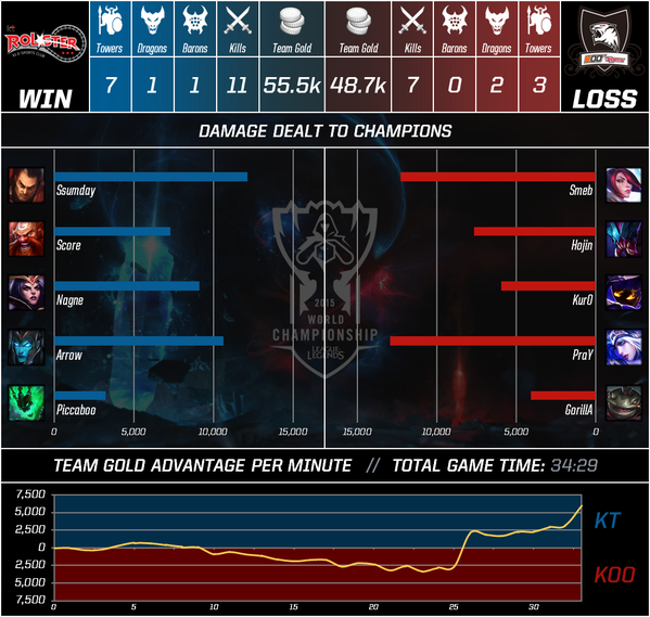 Im ersten Spiel war KOO's ADC Jong-in 'PraY' Kim in der Lage, seine geliebte Ashe zu spielen, was er in diesem Turnier bis jetzt immer tat, wenn diese nicht gebannt war. Generell kann man sagen, dass die erste Pick- und Bann-Phase besser für die Tigers ausfiel, die mit Tahm Kench als Support perfekt gegen die Pick-Komposition von KT ausgestattet war. Das Spiel begann dann, wie man es von diesen beiden Teams erwartet hatte. Beide spielten sehr viel um ihre Top-Laner herum, die mit Fiora gegen Darius auch eine interessante Lane gepickt hatten. Nach einem Solo-Kill von Chan-ho 'Ssumday' Kim und der kurz danach folgenden Revanche von Kyung-ho 'Smeb' Song, folgte ein fünf-Mann-Gank ebenfalls in der Top-Lane, um KT's Ssumday zu töten. Auch nach diesem aufwendigen Gank scheuten sich beide Teams nicht zu kämpfen, als nur zwei Minuten später ein nächster Kampf, dieses Mal in der Bot-Lane, ausbrach. Erneut mit besserem Ausgang für die Tigers. Nachdem dann lange nichts großes mehr geschah, resultierte ein verlorener Team-Kampf am Drachen von KOO zu einem Ace und Baron für KT, nachdem Midlaner Seo-haeng 'Kuro' Lee sich schlecht positionierte und schnell starb. KT war dadurch nach langer Zeit wieder mal im Vorsprung. Diesen Vorsprung konnten sie bei behalten und nach einem starkem Teleport von Ssumday einen weiteren Kampf gewinnen und damit auch das Spiel.