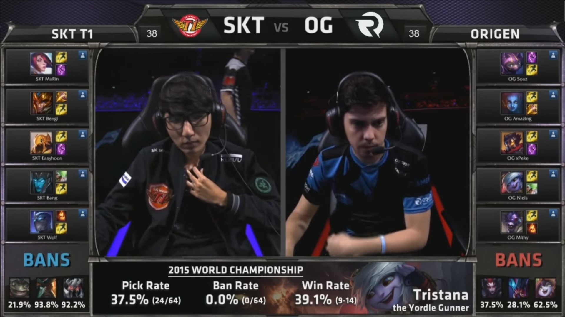 Origen jedoch zeigte erneut intelligent Rotationen: So standen sie in der 16. Minute mit vier Mann vor dem ersten Midlane-Turm von SKT, welchen sie auch zerstören konnten. OG rotierte weiter, fand Marin über dem Baron außerhalb seiner Position, töte diesen und konnte den zweiten Turm in der Top-Lane sichern, bevor man Marin erneut tötete. Es war der erste Turm der zweiten Reihe, der gegen SKT im kompletten Turnier fiel! Zudem hatte SKT zum ersten Mal auch ein Golddefizit zur 20. Minute.