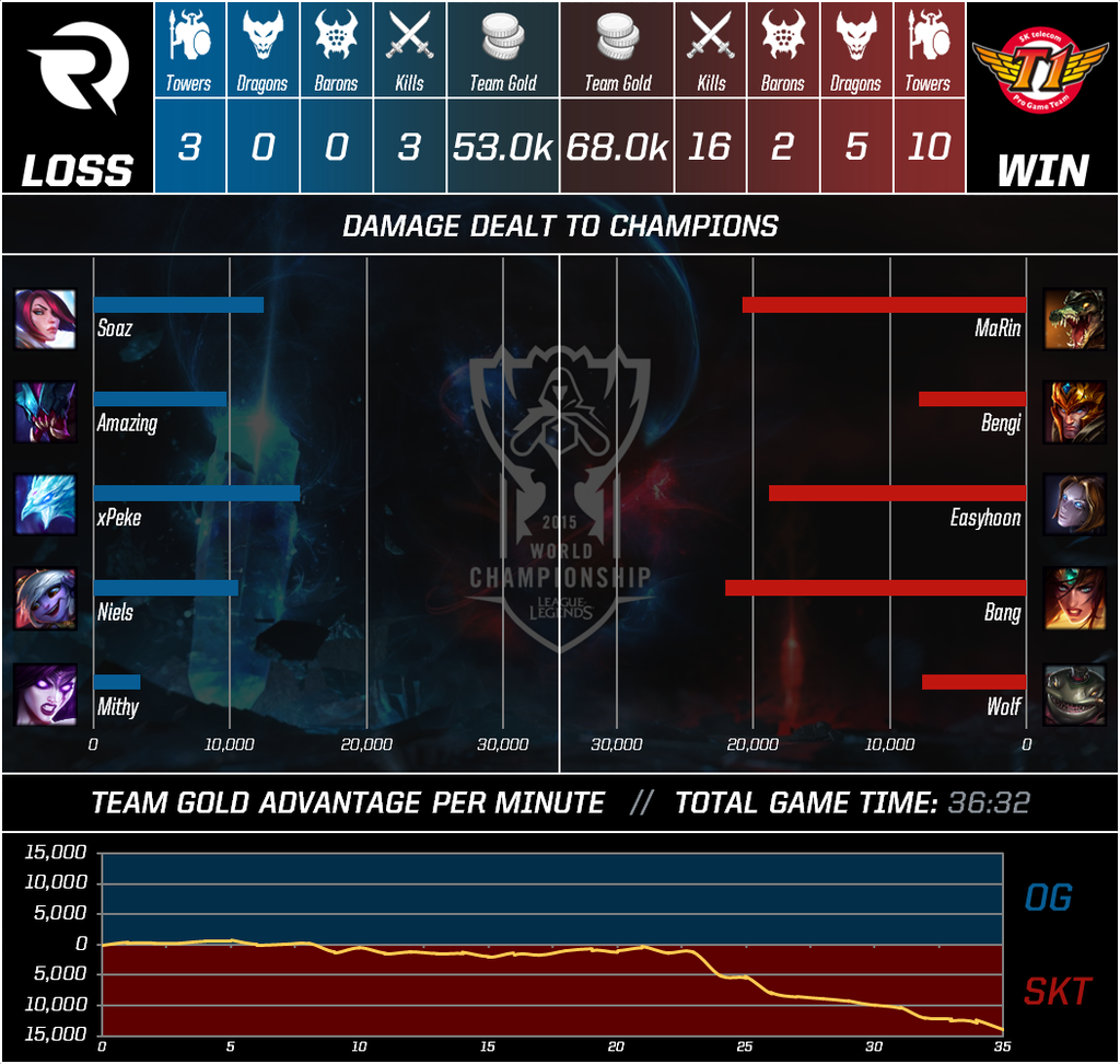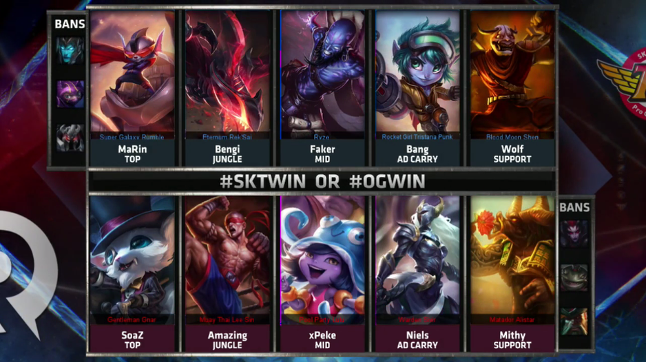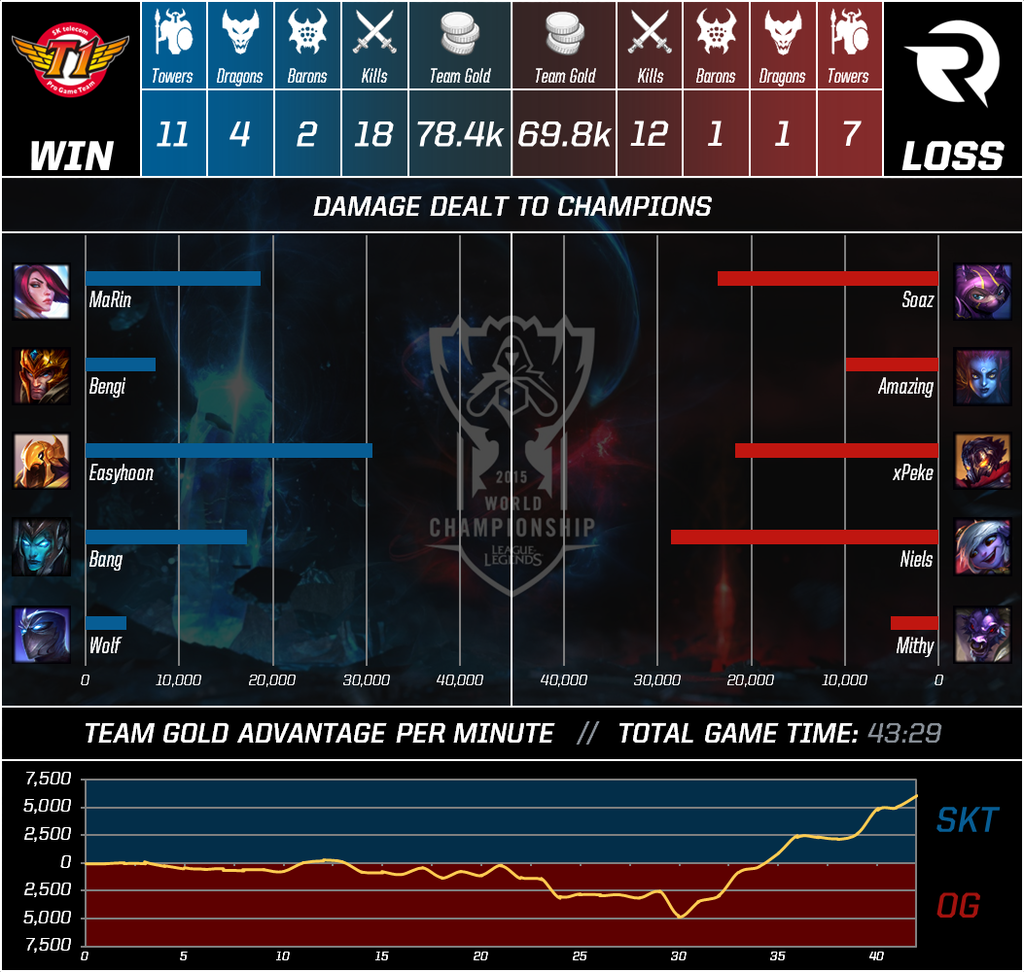 Marin konnte dann die Basis von OG auf der Top-Seite öffnen, während sein restliches Team dies von den beiden anderen Lanes erledigte. Nach einem letzten Teamkampf beendete SKT das Spiel in der 43. Spielminute.