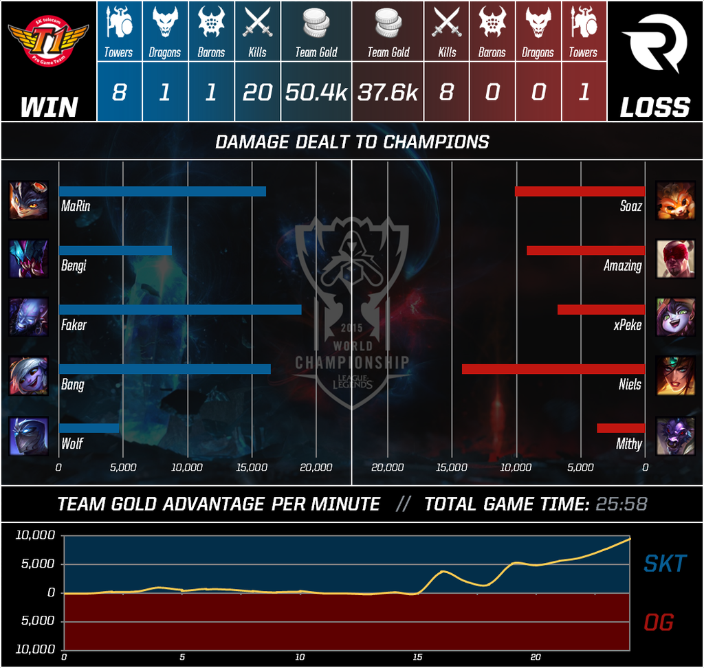 SKT hatte das Spiel aufgrund des hohen Goldvorteiles in der Hand. Darum konnten sie nach einer Belagerungssituation in der 25. Minute das Spiel beendeten.