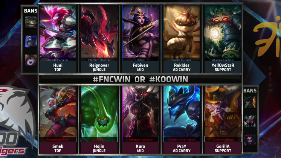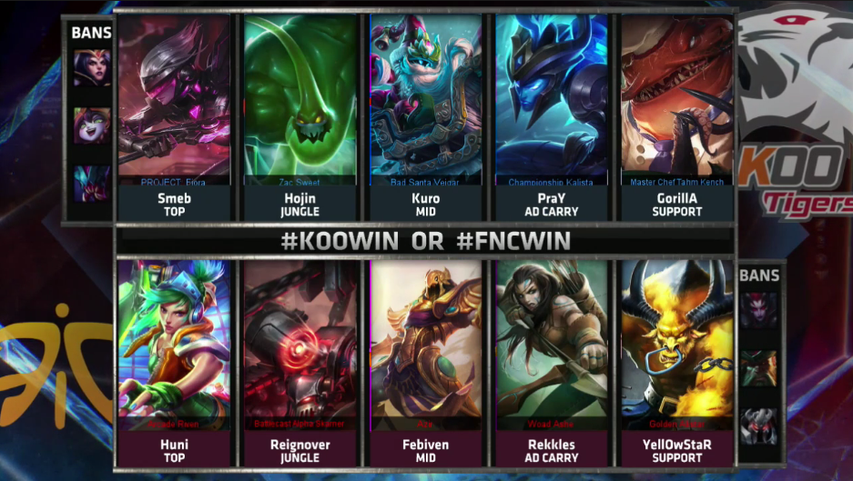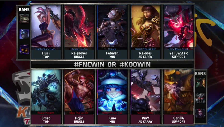 In der 11. Spielminute rotierte Lee 'Hojin' Ho-Jin in die Bot-Lane und man erwischte Bora 'YellOwStaR' Kim. Da FNC lediglich mit einem Teleport spielte, ihre Gegner jedoch mit zwei, konnte KOO aus der Kampfsituation drei Tötungen für Smeb erzielen, bevor Fabian 'Febiven' Diepstraten zusammen mit ReignOver den Kampf aufräumte. ReignOver sackte dadurch vier Tötungen ein, was sich zu einem Problem für FNC entwickelte, da gerade Rekkles oder Febiven dieses Gold dringend benötigt hätten.