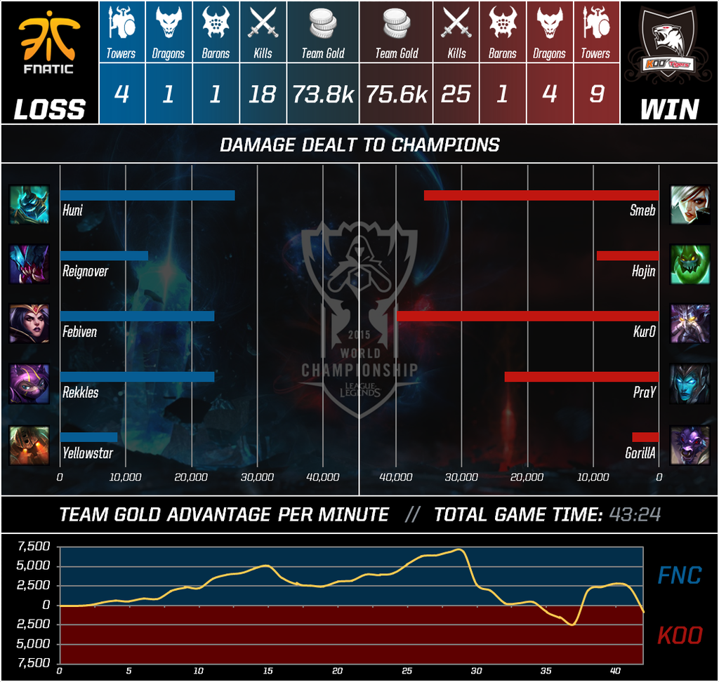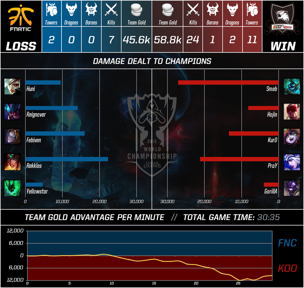 KOO nutzte die Fehler von FNC gnadenlos aus. Als in der 20. Spielminute FNC zu einem Dive in der Bot-Lane ansetzte, konnte KOO eine Dreifachtötung für Seo-haeng 'Kuro' Lee erzielen. Auch wenige Minuten später konnte KOO mit einer erneut guten Rotation Martin 'Rekkles' Larsson töten und den ersten Turm in der Botlane von FNC sichern.