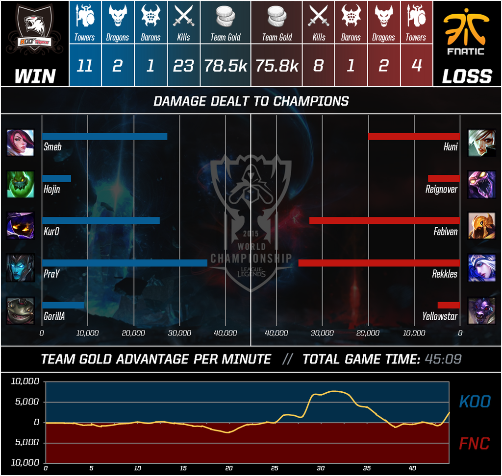 So war es auch kein Wunder, dass KOO sich den frühzeitigen Baron sicherte und Smeb, welcher zu diesem Zeitpunkt nahezu unbesiegbar war, alleine auf die Bot-Lane schickte, während das restliche Team die Top-Lane belagerte. KOO sicherte sich zwei Inhibitoren, teleportierte sich zurück zu ihrer Basis, initiierte den letzten Teamkampf unter den Nexus Türmen von FNC und beendete das Spiel nach 31 Minuten.