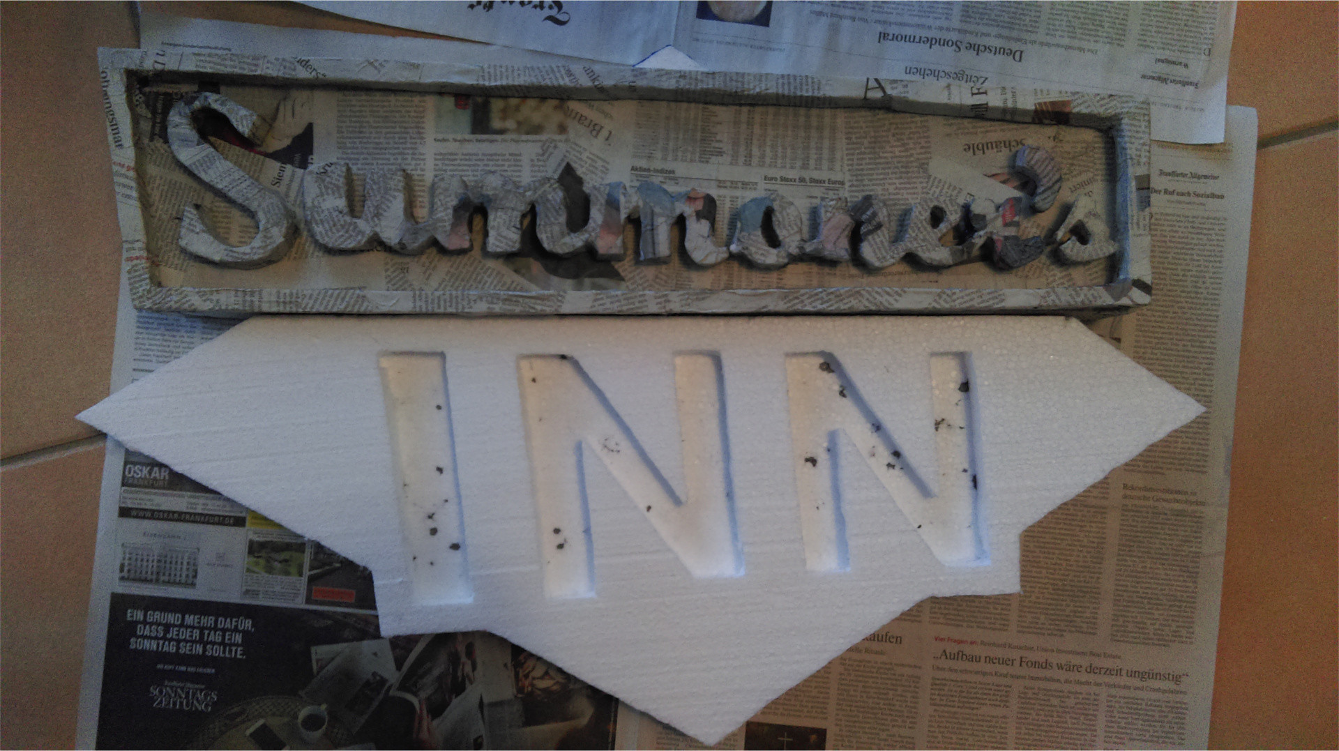 Das Logo besteht nun aus einem zusammenhängenden Teil, welches aber noch mit einer Pappmachéschicht eingekleistert werden muss/kann, da die Übergänge zwischen den einzelnen Teilen und die Poren des Styropors nicht schön aussehen. Diesen Schritt könnt ihr auch überspringen, da er relativ zeitintensiv ist und einen in den Wahnsinn treiben kann (vor allem bei den kleinen Ecken und Details). Trotzdem wird das Endergebnis mit Pappmaché vermutlich besser aussehen.