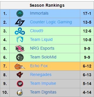 Abschlusstabelle der regulären SaisonNoch nie zuvor hatte TSM die Hälfte aller Spiele eines Splits verloren und dementsprechend gering waren die Erwartungen vor dem ersten Play-Off Spiel gegen Cloud9. Nachdem das erste Spiel bereits nach 25 Minuten verloren ging, waren sich die meisten Zuschauer sicher, dass es ein kurzer Abend werden würde und Cloud 9 ohne große Mühe die nächste Runde erreicht. Doch das Erste war gleichzeitig das letzte Spiel, welches Team SoloMid an diesem Tag verlieren sollte. Fast wie ausgewechselt trat man in den folgenden drei Spielen auf, ließ Cloud 9 nicht den Hauch einer Chance, und beendete das Bo5 mit einem starken 3:1.