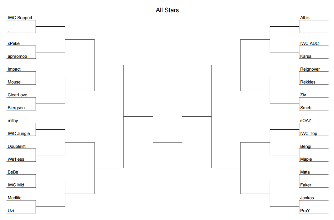 In der ersten Runde des 1v1-Turniers treffen der dreimalige World Champion Sang-hyeok 'Faker' Lee und Se-hyeong 'Mata' Cho, MVP der Season 4 World Championship, aufeinander. Die beiden Publikumslieblinge aus Europa und Nordamerika, Enrique 'xPeke' Cedeño Martínez und Zaqueri 'aphromoo' Black, werden ebenfalls in der ersten Runde gegeneinander antreten. Das vollständige Bracket hat ein Reddit-User als kompaktes Paint-Bild gepostet: