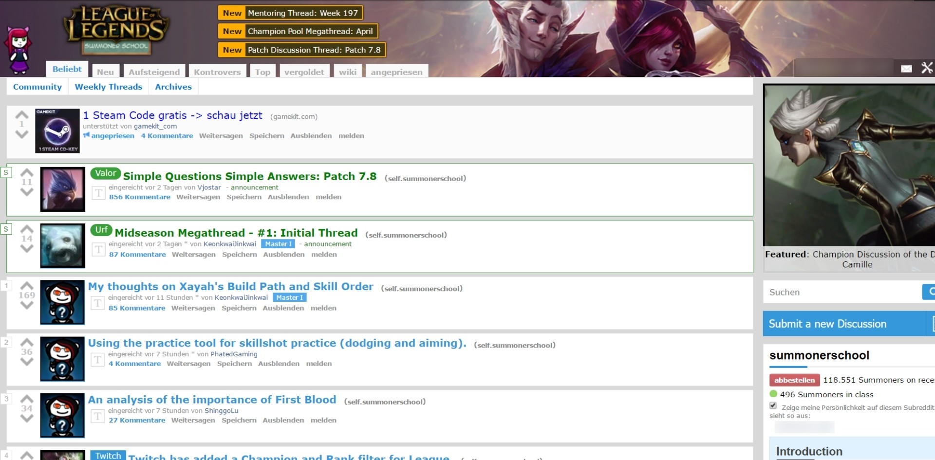 Wer sein Englisch für tauglich genug empfindet und über die äußerst lehrreichen Videos unseres Maxim hinaus weiter League of Legends studieren will, der ist auf dem Subreddit "summonerschool" genau richtig. Die Community versucht, die eingehenden Fragen detailliert zu beantworten und Guides zu schreiben, die euch und euer Spielverständnis auf das nächste Level bringen können. Für die fleißigen oder ambitionierten Spieler unserer Leserschaft ist die Seite definitiv einen Besuch wert.