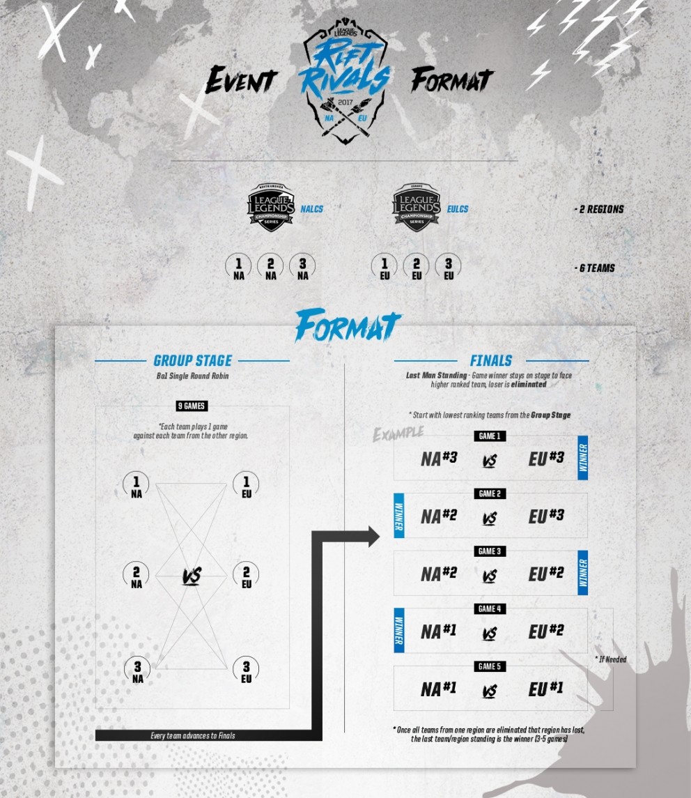 In der Gruppenphase wird jedes europäische Team gegen jedes nordamerikanische Team spielen. Nach Ablauf dieser 9 Spiele kommt es zu den Finals. Hier treten die beiden Regionen gegeneinander an, indem im ersten Match jeweils das schlechteste Team der Gruppenphase startet. Der Gewinner spielt ein weiteres Match gegen ein Team der anderen Region, der Verlierer scheidet aus. Die Region, die als erstes kein Team mehr ins Rennen schicken kann, verliert.