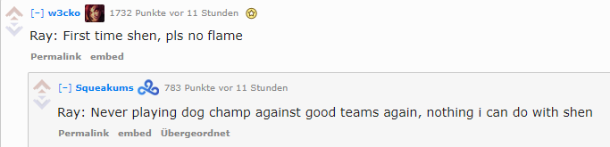 Ji-won 'Ray' Jeon zeigte mit Shen gegen seinen Kontrahenten Ho-Jong 'Flame' Lee nicht seine beste Leistung. Ein Reddit-User nutzte dies zum Anlass, eine allseits bekannte Solo-Queue-Floskel mit einem Wortspiel zu versehen. Zudem erinnerte die Situation einen User an die Reaktion eines gewissen Fnatic-Spielers nach dem zweiten Spiel gegen TSM beim Rift Rivals-Clash.