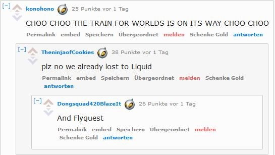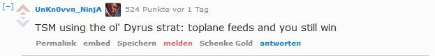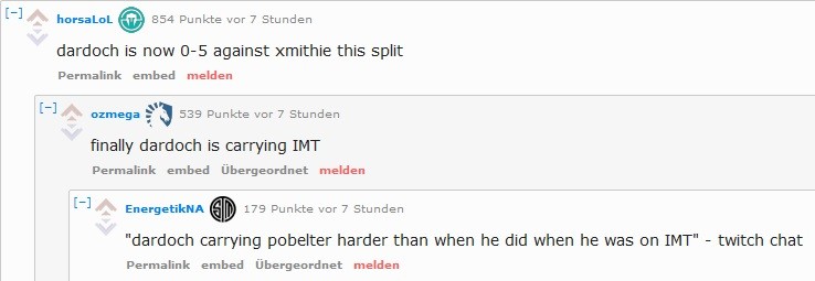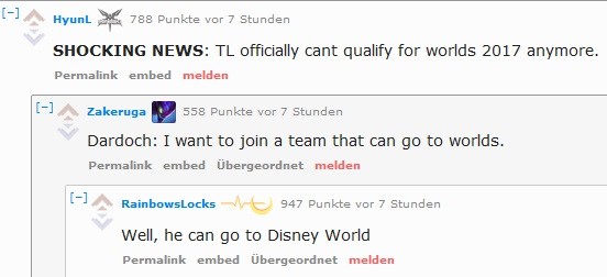 Auch ein weiterer Kommentar zu Joshua 'Dardoch' Hartnett ließ viele Reddit-User erheitert zurück. Dieser wurde zuletzt von Counter Logic Gaming entlassen und wechselte zurück zu Team Liquid. Mit dem Team erreicht der als toxic berüchtigte Spieler sein Worlds-Ziel allerdings ganz bestimmt nicht. Nach der Investition von Disney in die Investorengruppe, die hinter TL steht, eröffnet sich Dardoch aber wohl eine schöne Alternative für die Worlds.