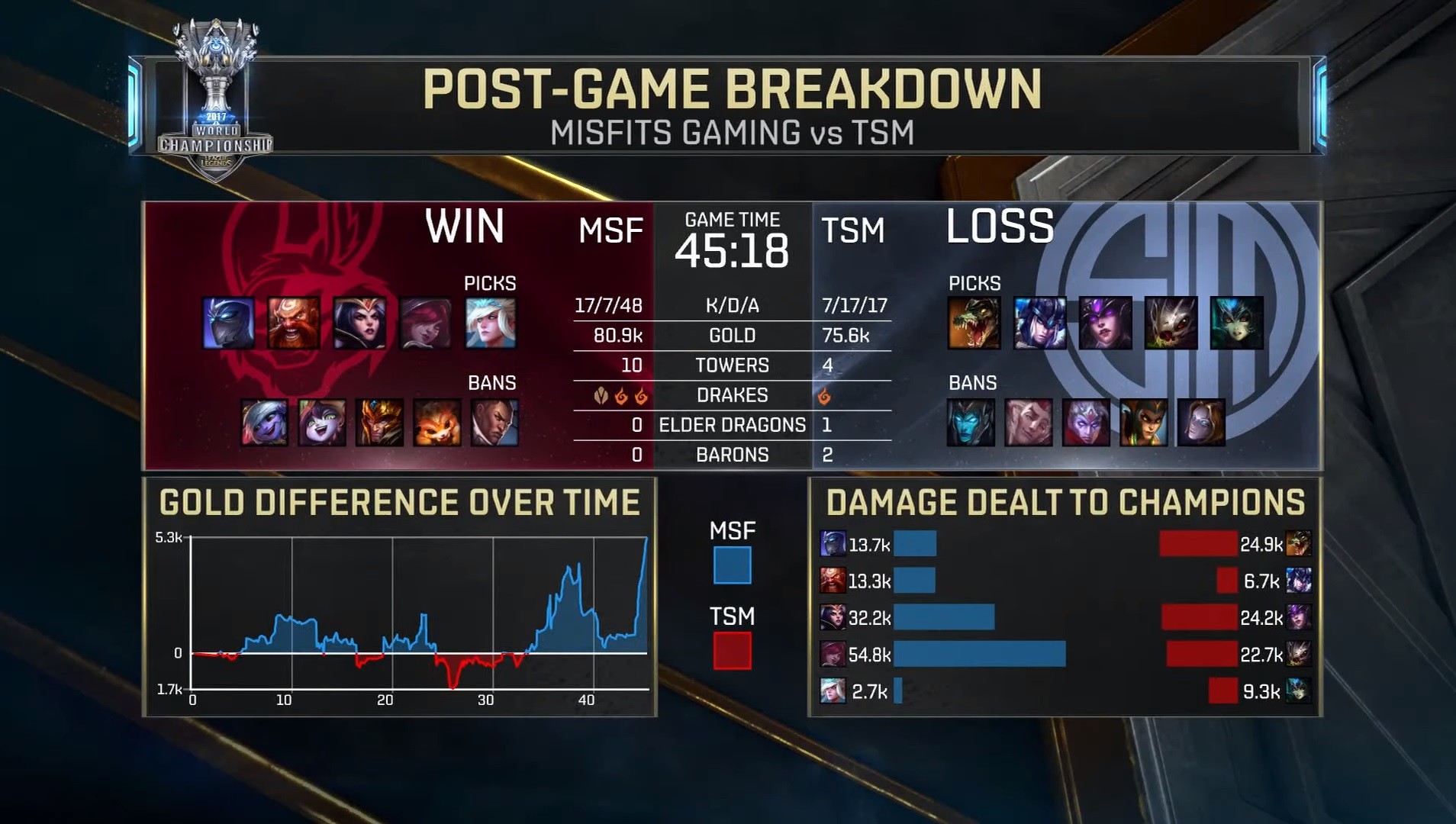 Trotz des neutralen Buffs für den Gegner bleiben die Misfits goldtechnisch leicht in Führung. Im weiteren Verlauf bekommen die Nordamerikaner einen weiteren Baron, schenken dafür aber zwei Kills und den mittleren Inhibitor her. Ein bärenstarker Nubar 'Maxlore' Sarafian findet Yiliang 'Doublelift' Peng und die Misfits zerstören fast beide Nexus-Tower, verlieren anschließend aber den Elder Drake. Mit zwei großen Minion-Wellen in den Side-Lanes zwingen die Europäer TSM dazu, Baron Nashor zu starten, gewinnen den anschließenden Fight und damit das Spiel.