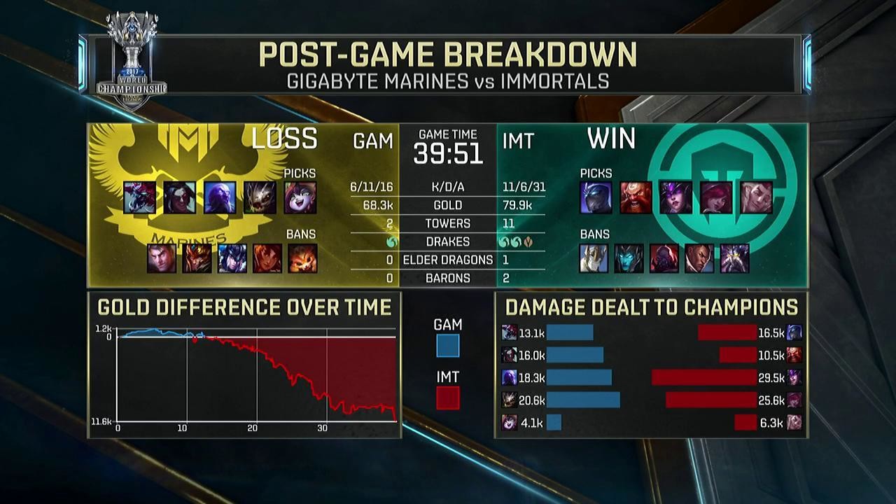 Die GIGABYTE Marines packen in ihrem letzten Match der Hinrunde Jungle-Kayn aus. Die Immortals finden im Early- und Mid-Game aber immer wieder Vorteile auf der gesamten Map und versuchen mit einem massiven Vorteil und dem Baron-Buff, das Spiel zu beenden. Die Marines verteidigen ihre Basis zunächst, aber nach 40 Minuten knacken die Immortals auch die letzte Hürde und siegen.