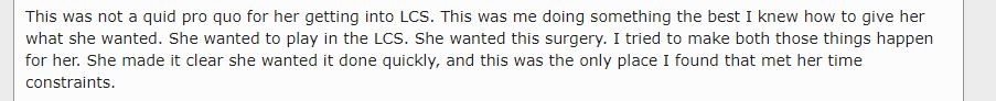 Er betont weiterhin, es sei keinesfalls eine quid pro quo Situation gewesen. Er habe Maria lediglich helfen wollen, ihre Träume zu realisieren: eine Geschlechtsangleichung durchführen zu lassen und in der LCS zu spielen.