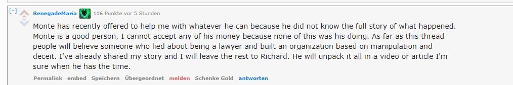 Dieser äußerte sich nach Marias Anschuldigungen gegen ihn ebenfalls auf Reddit über den Vorfall. Welche Version der Wahrheit entspricht, kann zum aktuellen Zeitpunkt nicht festgestellt werden.