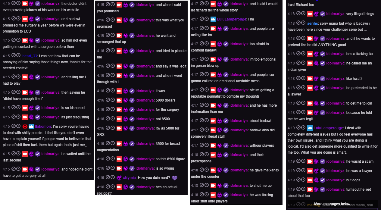 Badawi auf der anderen Seite gibt an, Maria hätte gesagt, dass sie ohne eine Geschlechtsanpassung nicht in der LCS spielen würde. In einem AMA auf Reddit vom Juli 2016 hatte er allerdings geschrieben, dass er ihr diese schon während ihres ersten Skype-Calls versprochen hatte, was einen Gegensatz zu seinen neuesten Aussagen darstellt.