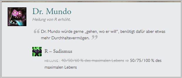Wenig überraschend ist, dass Mundo nach wie vor als Full-Tank gespielt wird. Das ist natürlich sinnvoll, weil sein Schaden, abgesehen von einem AP-Scaling auf dem W (10%), nur mit Leben skaliert.