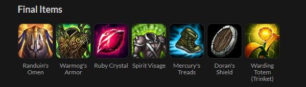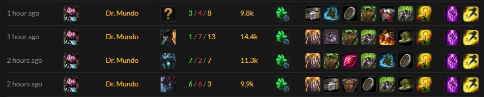 Der ehemalige LCK-Top-Laner Ik-soo 'ikssu' Jeon hat Dr. Mundo in den letzten Tagen häufig gespielt. Für ihn gehören, genau wie bei vielen anderen Mundo-Spielern, Warmog's Armor und die Spirit Visage zum absoluten Core-Itembuild. Je nach Situation spielt er auch gerne mit Randuin's Omen oder dem Sunfire Cape.