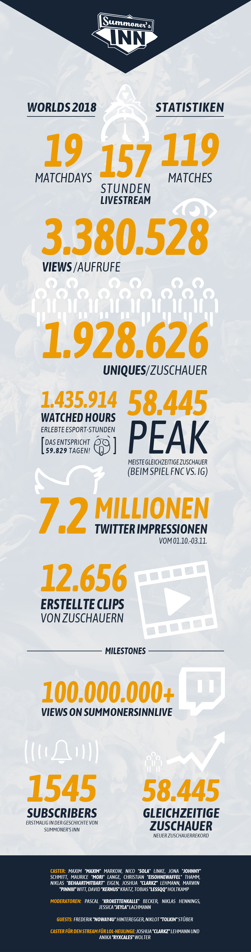Insgesamt haben über 1,9 Millionen User unseren Worlds-Stream eingeschaltet. Wir bedanken uns für eure Unterstützung! In der folgenden Grafik findet ihr alle Zahlen zu den Worlds 2018 bei Summoner's Inn im Überblick: