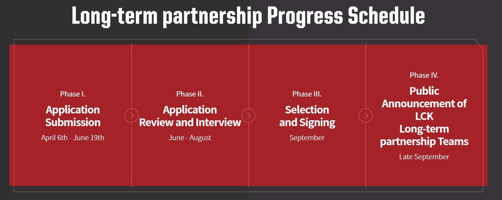 Bis zum 8. Mai haben Organisationen Zeit, ihr Interesse zu bekunden. Bis zum 19. Juni müssen die vollständigen Bewerbungen eingehen. Von Juni bis August sollen Gespräche mit den Interessenten geführt werden, ehe Riot Korea die Partner für das neue System auswählt. Ende September sollen die LCK-Teams für 2021 feststehen.