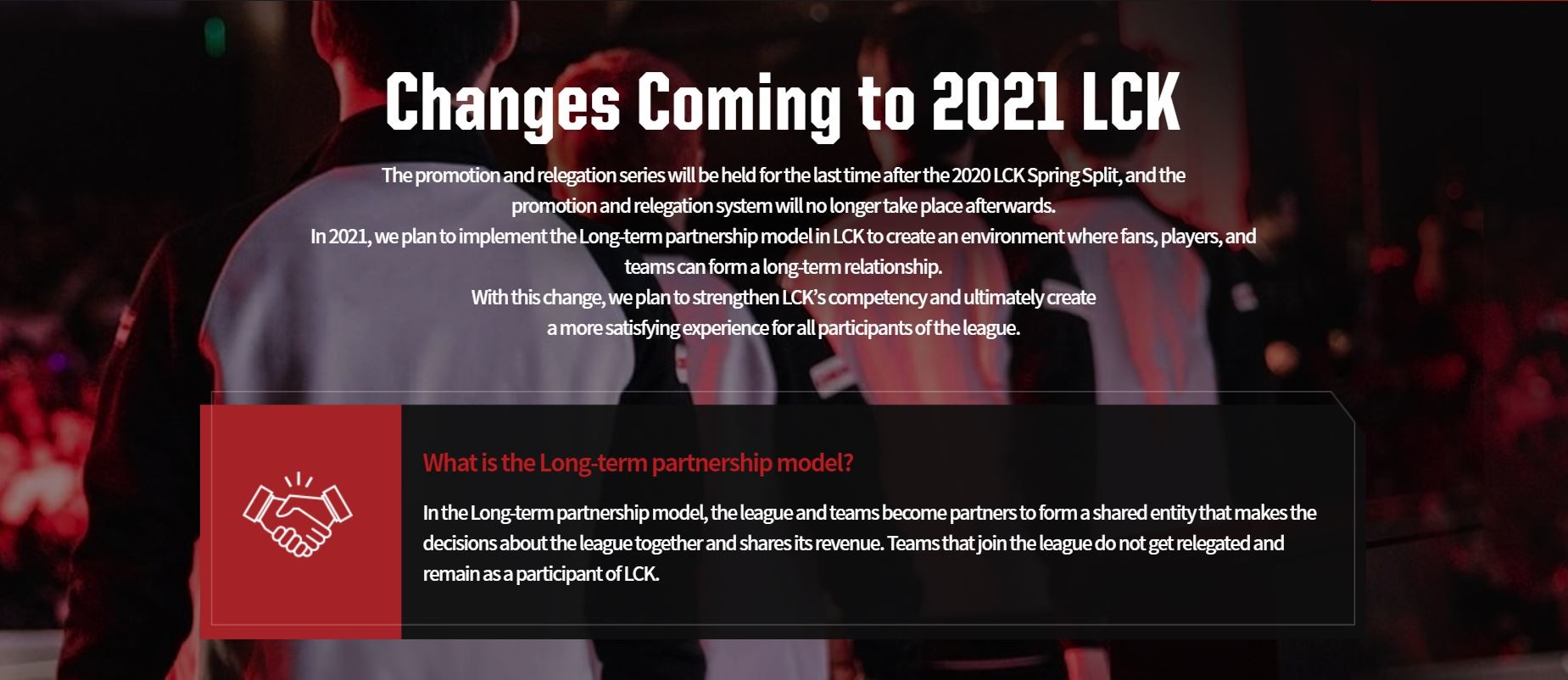 Zudem wird Riot Games wie in anderen Ligen mit dem sogenannten Longterm-Partnership-System seine LCK-Einnahmen mit den in der Liga spielenden Organisationen teilen. Langfristigkeit, finanzielle Sicherheit und ein besseres sportliches Umfeld sollen für Spieler und Teams im Vordergrund stehen.