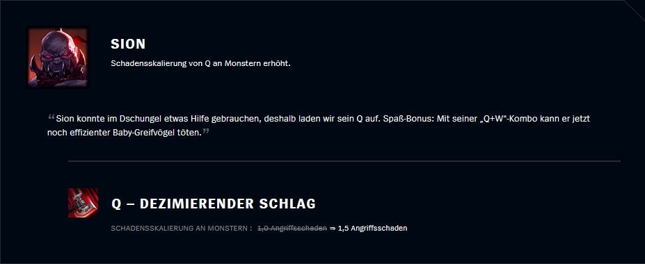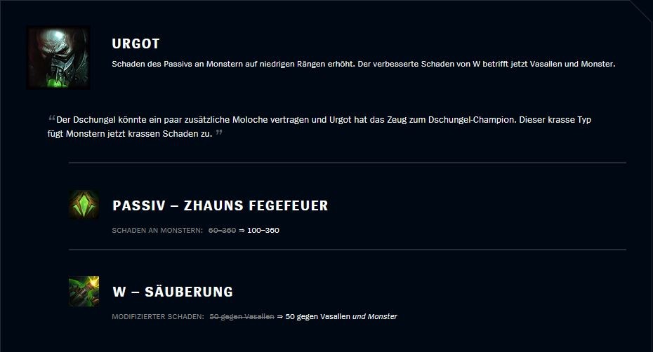 Mit Sion und Urgot versucht Riot Games, zwei Top-Laner zu einer sinnvollen Option im Jungle zu machen. Sion erhält einen Schadens-Buff seiner Q-Fähigkeit gegen Monster. Urgot verursacht sowohl mit seiner Passive als auch mit seinem W-Skill mehr Schaden an Monstern.