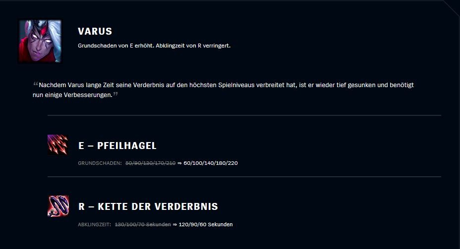 Ähnlich wie Aatrox gehörte auch Varus in der ersten Jahreshälfte zu den populären Champions im professionellen League of Legends, wurde dadurch aber mehrfach generft. Nun gibt ihm Riot wieder etwas mehr Stärke: Seine E-Fähigkeit verursacht mehr Schaden und seine Ultimate erhält einen niedrigeren Cooldown.